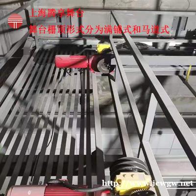 舞台栅顶形式分为满铺式和马道式,满铺式栅顶是一个由钢格板全部铺满的工作平台,占满了舞台上空的全部空间,距离屋顶约2-2.5m高度,配置有横向主承重大梁和滑轮大梁,可以满足所有舞台吊杆、单点吊、灯光渡桥等台上设备的安装需要,上图即为满铺式栅顶