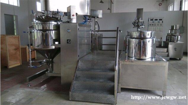 沙拉酱真空乳化机成套真空乳化机采用的德国均质乳化技术,罐体采用锥体罐与下面的均质机精密结合,预混采用双向搅拌的刮壁搅拌机,也就是当物料在真空乳化锅内正常搅拌式,可以将搅拌机瞬间停止,然后反转,这样可以使搅拌机与物料在瞬间形成对流,可以将预混时间大大缩短,预混效果大大改善。