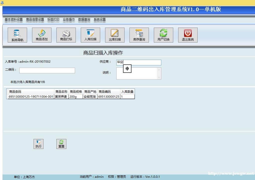 (1)扫描需要入库的商品,点击执行完成入库。如图示:
