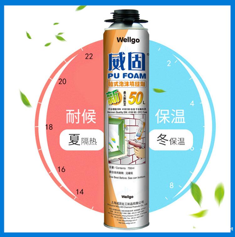威固单组分聚氨酯泡沫填缝剂,特别适用于门窗缝隙的填充,其特点是填充长度可达30延长米(宽3cm 深6cm的标准缝隙)。如果在50%相对湿度,25℃相对温度的条件下延长效果更佳,泡沫在喷出后可立即膨胀,快速固化,有效提高了施工效率的同时,还具备很好的弹性及粘接性,充分保证了填充缝隙的坚固及防水密封。高弹性优势,产品富有很高的回弹性能,减少对基材移位、变形而造成不必要的损失。
